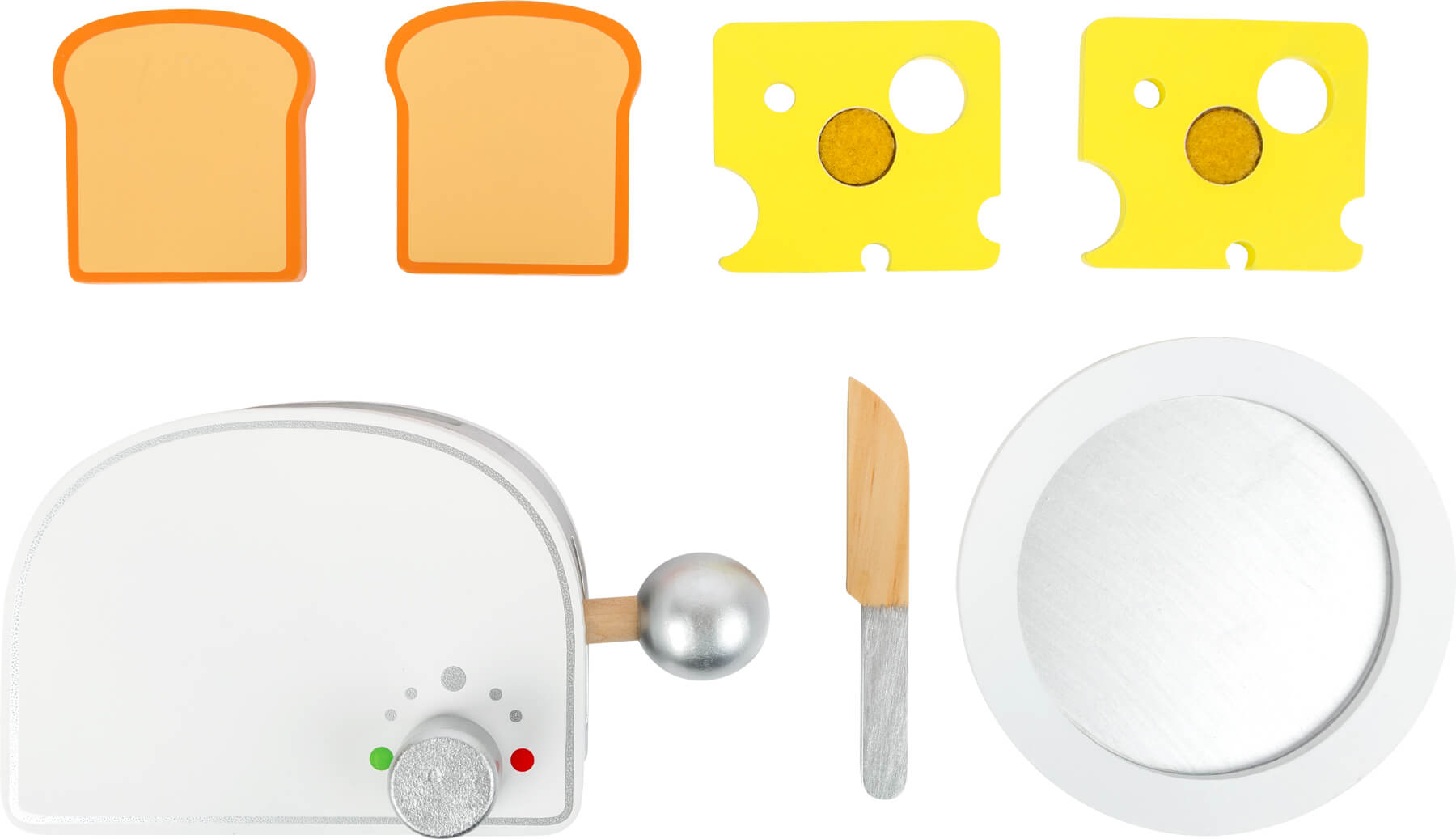 Morgenmads sæt med toaster, to skiver toast og to skiver ost, en skærekniv og en tallerken